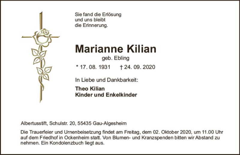 Hier finden Sie alle Traueranzeigen aus der Zeitung, die bisher für Marianne Kilian erschienen sind. Weitere Traueranzeigen, die in der Zeitung erscheinen, werden hier ebenfalls aufgelistet