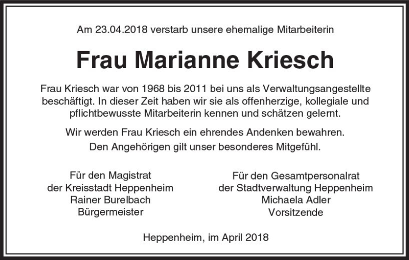 Hier finden Sie alle Traueranzeigen aus der Zeitung, die bisher für Marianne Kriesch erschienen sind. Weitere Traueranzeigen, die in der Zeitung erscheinen, werden hier ebenfalls aufgelistet