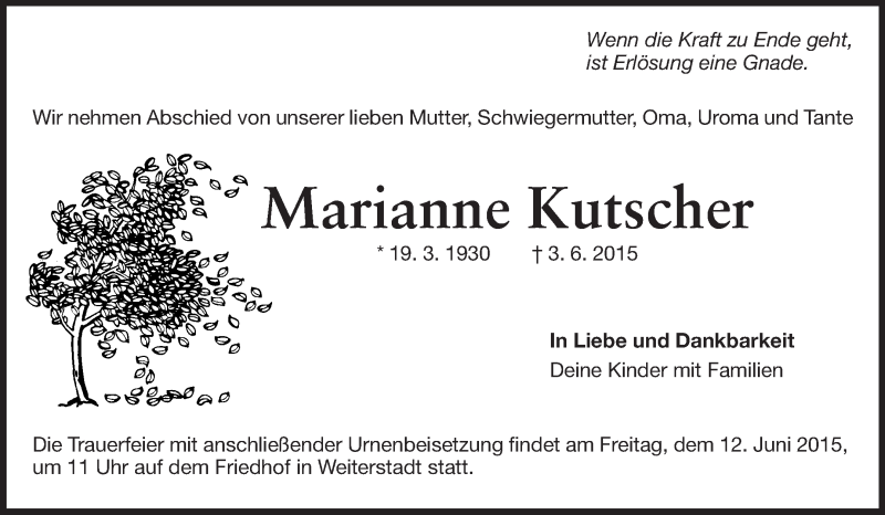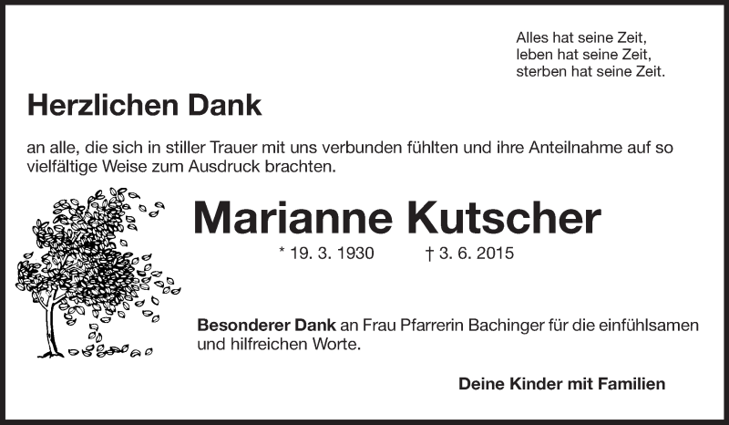 Hier finden Sie alle Traueranzeigen aus der Zeitung, die bisher für Marianne Kutscher erschienen sind. Weitere Traueranzeigen, die in der Zeitung erscheinen, werden hier ebenfalls aufgelistet