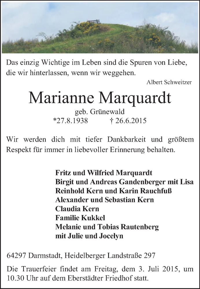 Hier finden Sie alle Traueranzeigen aus der Zeitung, die bisher für Marianne Marquardt erschienen sind. Weitere Traueranzeigen, die in der Zeitung erscheinen, werden hier ebenfalls aufgelistet