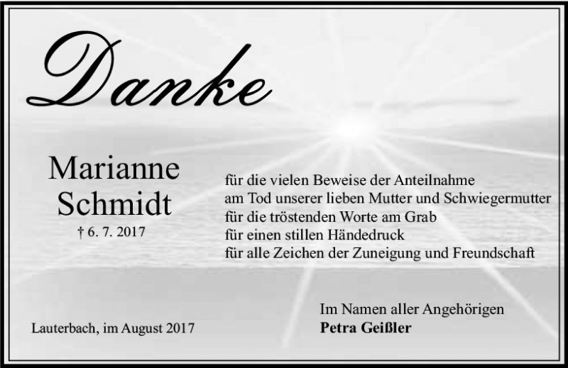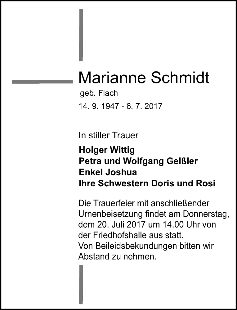 Hier finden Sie alle Traueranzeigen aus der Zeitung, die bisher für Marianne Schmidt erschienen sind. Weitere Traueranzeigen, die in der Zeitung erscheinen, werden hier ebenfalls aufgelistet
