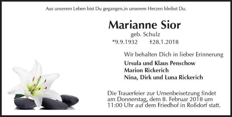 Hier finden Sie alle Traueranzeigen aus der Zeitung, die bisher für Marianne Sior erschienen sind. Weitere Traueranzeigen, die in der Zeitung erscheinen, werden hier ebenfalls aufgelistet