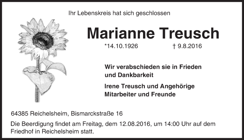 Hier finden Sie alle Traueranzeigen aus der Zeitung, die bisher für Marianne Treusch erschienen sind. Weitere Traueranzeigen, die in der Zeitung erscheinen, werden hier ebenfalls aufgelistet