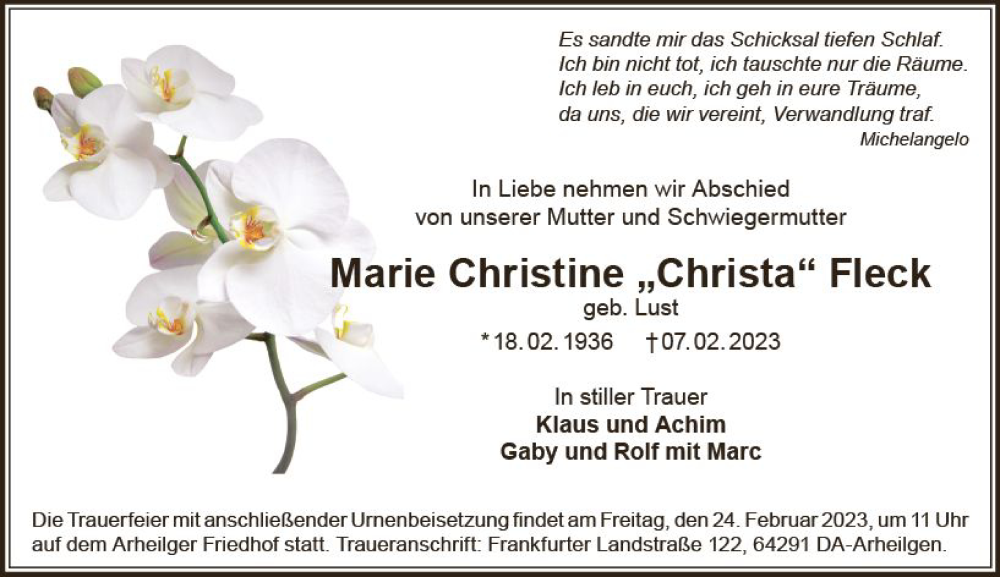 Hier finden Sie alle Traueranzeigen aus der Zeitung, die bisher für Marie Christine Fleck erschienen sind. Weitere Traueranzeigen, die in der Zeitung erscheinen, werden hier ebenfalls aufgelistet