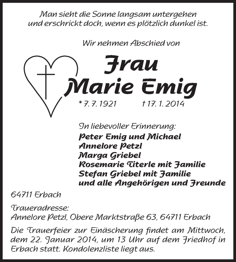 Hier finden Sie alle Traueranzeigen aus der Zeitung, die bisher für Marie Emig erschienen sind. Weitere Traueranzeigen, die in der Zeitung erscheinen, werden hier ebenfalls aufgelistet