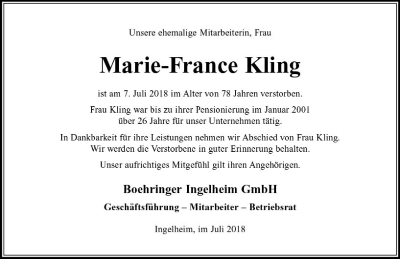 Hier finden Sie alle Traueranzeigen aus der Zeitung, die bisher für Marie-France Kling erschienen sind. Weitere Traueranzeigen, die in der Zeitung erscheinen, werden hier ebenfalls aufgelistet