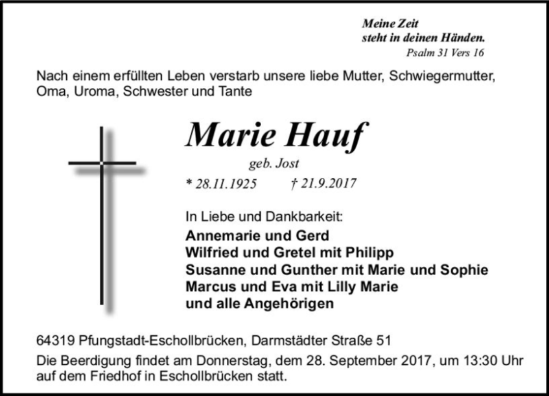 Hier finden Sie alle Traueranzeigen aus der Zeitung, die bisher für Marie Hauf erschienen sind. Weitere Traueranzeigen, die in der Zeitung erscheinen, werden hier ebenfalls aufgelistet