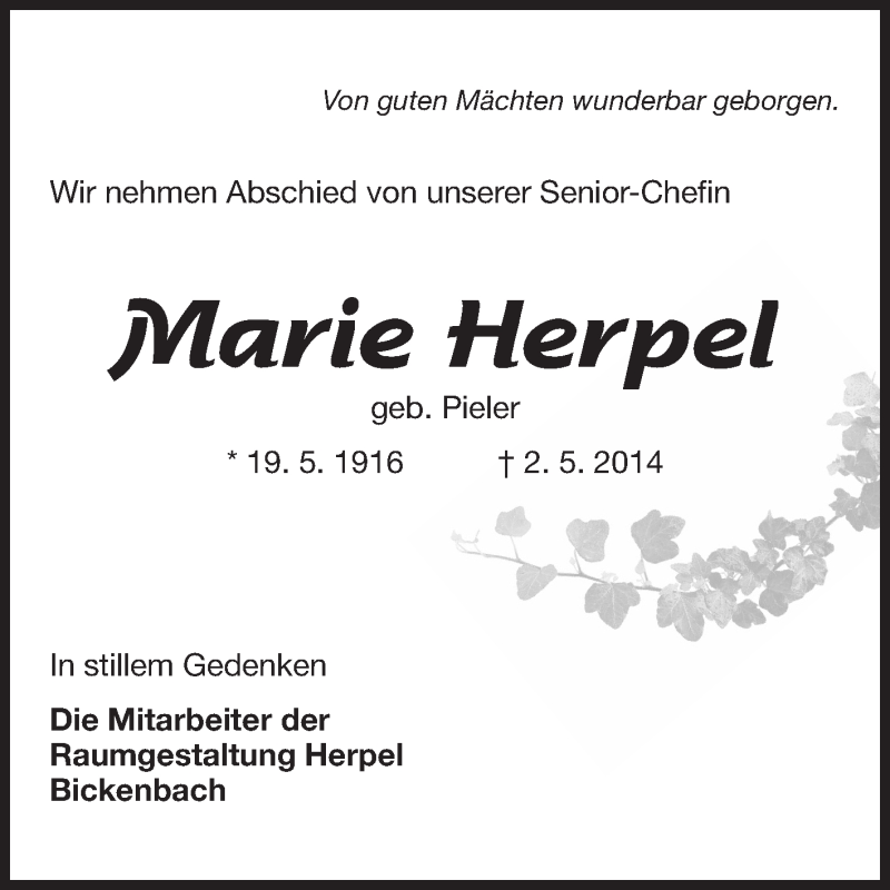 Hier finden Sie alle Traueranzeigen aus der Zeitung, die bisher für Marie Herpel erschienen sind. Weitere Traueranzeigen, die in der Zeitung erscheinen, werden hier ebenfalls aufgelistet