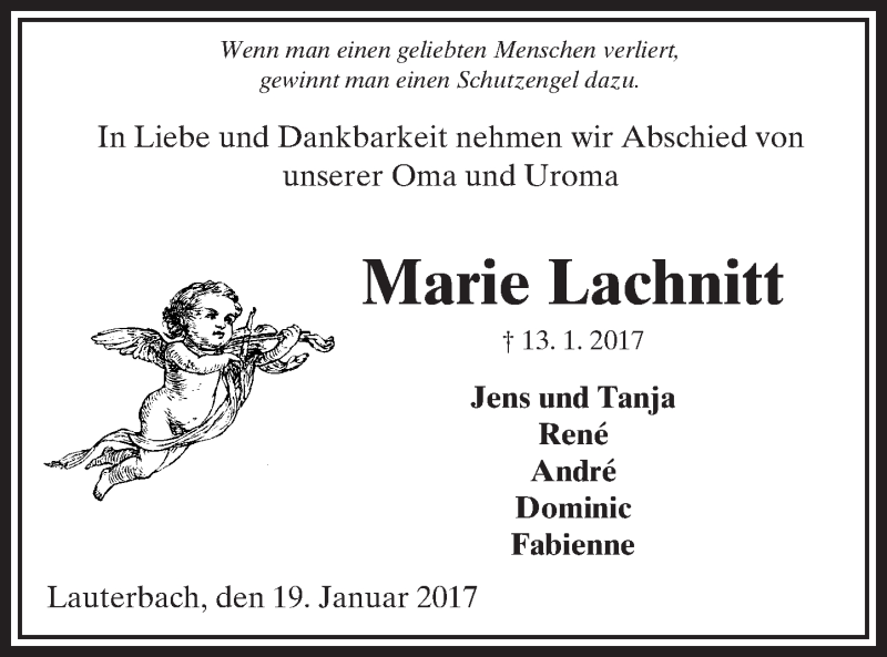 Hier finden Sie alle Traueranzeigen aus der Zeitung, die bisher für Marie Lachnitt erschienen sind. Weitere Traueranzeigen, die in der Zeitung erscheinen, werden hier ebenfalls aufgelistet