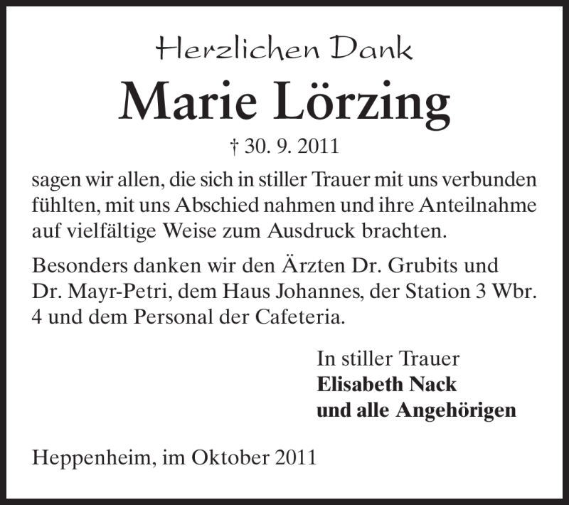 Hier finden Sie alle Traueranzeigen aus der Zeitung, die bisher für Marie Lörzing erschienen sind. Weitere Traueranzeigen, die in der Zeitung erscheinen, werden hier ebenfalls aufgelistet
