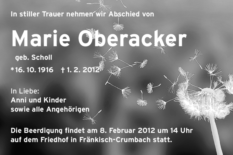 Hier finden Sie alle Traueranzeigen aus der Zeitung, die bisher für Marie Oberacker erschienen sind. Weitere Traueranzeigen, die in der Zeitung erscheinen, werden hier ebenfalls aufgelistet