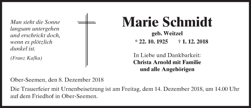 Hier finden Sie alle Traueranzeigen aus der Zeitung, die bisher für Marie Schmidt erschienen sind. Weitere Traueranzeigen, die in der Zeitung erscheinen, werden hier ebenfalls aufgelistet