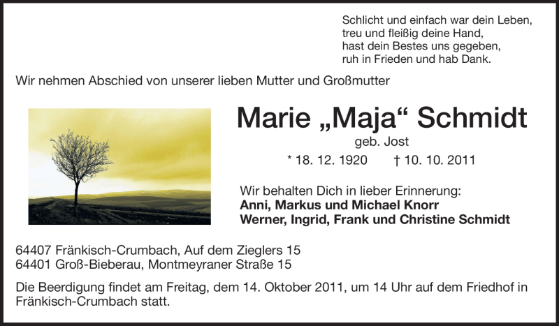 Hier finden Sie alle Traueranzeigen aus der Zeitung, die bisher für Marie Schmidt erschienen sind. Weitere Traueranzeigen, die in der Zeitung erscheinen, werden hier ebenfalls aufgelistet