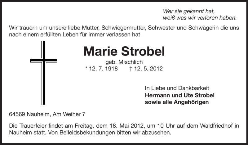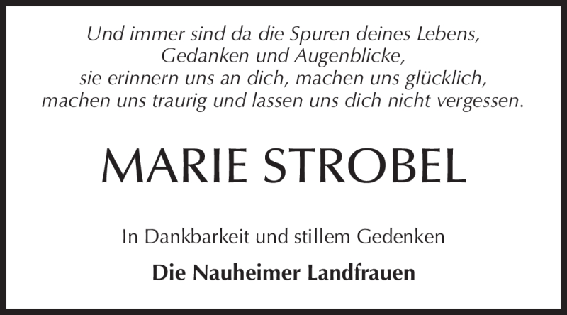 Hier finden Sie alle Traueranzeigen aus der Zeitung, die bisher für Marie Strobel erschienen sind. Weitere Traueranzeigen, die in der Zeitung erscheinen, werden hier ebenfalls aufgelistet