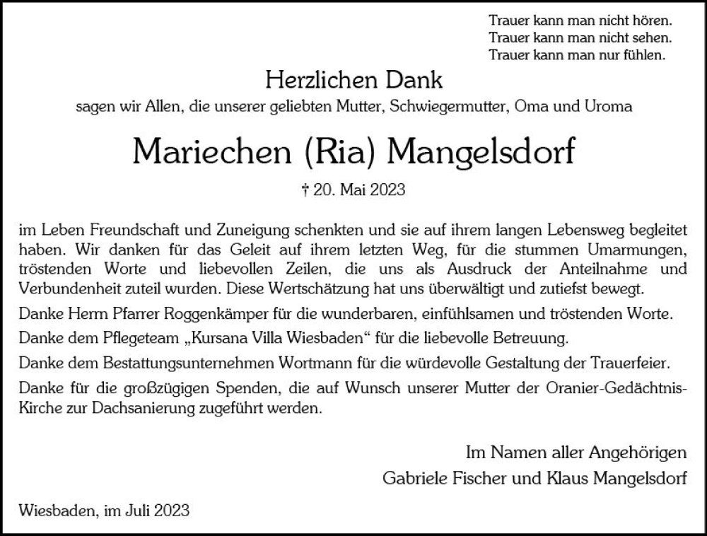 Hier finden Sie alle Traueranzeigen aus der Zeitung, die bisher für Mariechen Mangelsdorf erschienen sind. Weitere Traueranzeigen, die in der Zeitung erscheinen, werden hier ebenfalls aufgelistet