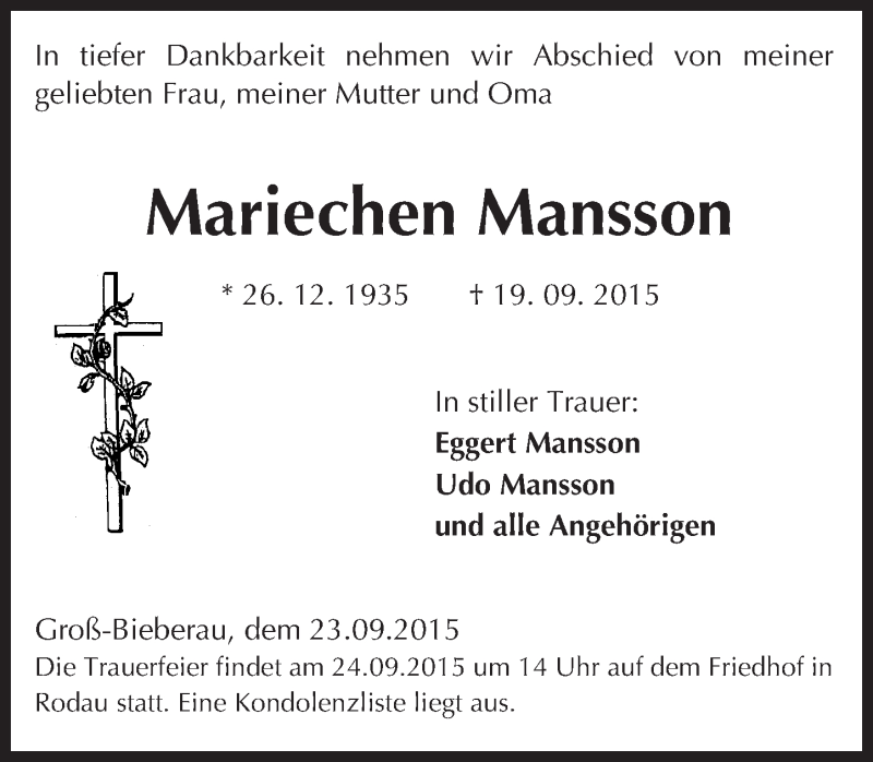 Hier finden Sie alle Traueranzeigen aus der Zeitung, die bisher für Mariechen Mansson erschienen sind. Weitere Traueranzeigen, die in der Zeitung erscheinen, werden hier ebenfalls aufgelistet