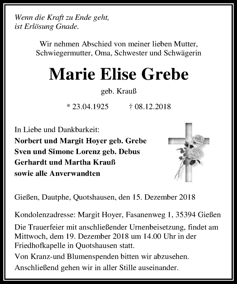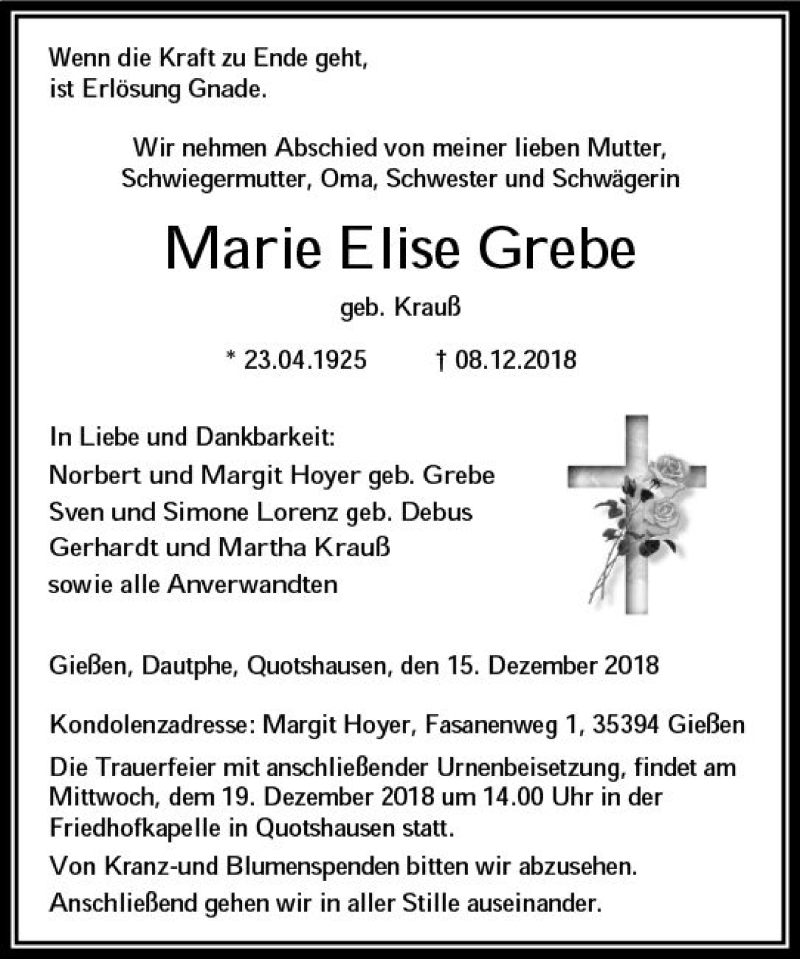 Hier finden Sie alle Traueranzeigen aus der Zeitung, die bisher für Marie Elise Grebe erschienen sind. Weitere Traueranzeigen, die in der Zeitung erscheinen, werden hier ebenfalls aufgelistet