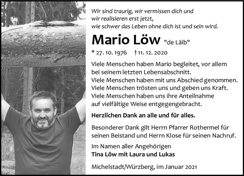 Hier finden Sie alle Traueranzeigen aus der Zeitung, die bisher für Mario Löw erschienen sind. Weitere Traueranzeigen, die in der Zeitung erscheinen, werden hier ebenfalls aufgelistet
