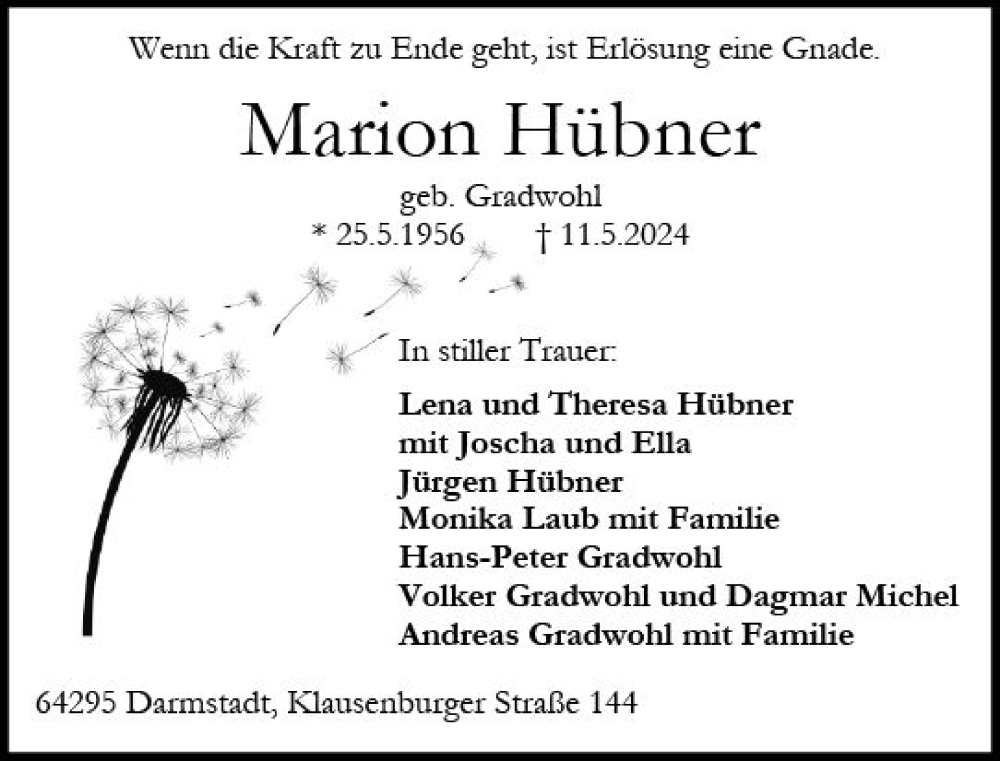 Hier finden Sie alle Traueranzeigen aus der Zeitung, die bisher für Marion Hübner erschienen sind. Weitere Traueranzeigen, die in der Zeitung erscheinen, werden hier ebenfalls aufgelistet