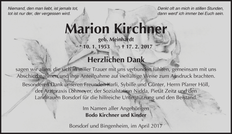 Hier finden Sie alle Traueranzeigen aus der Zeitung, die bisher für Marion Kirchner erschienen sind. Weitere Traueranzeigen, die in der Zeitung erscheinen, werden hier ebenfalls aufgelistet