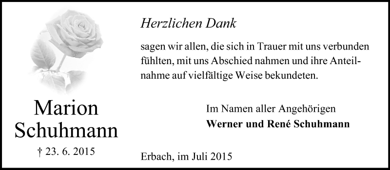 Hier finden Sie alle Traueranzeigen aus der Zeitung, die bisher für Marion Schuhmann erschienen sind. Weitere Traueranzeigen, die in der Zeitung erscheinen, werden hier ebenfalls aufgelistet