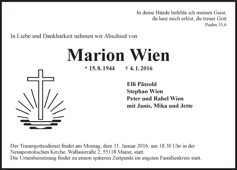 Hier finden Sie alle Traueranzeigen aus der Zeitung, die bisher für Marion Wien erschienen sind. Weitere Traueranzeigen, die in der Zeitung erscheinen, werden hier ebenfalls aufgelistet