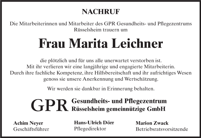 Hier finden Sie alle Traueranzeigen aus der Zeitung, die bisher für Marita Leichner erschienen sind. Weitere Traueranzeigen, die in der Zeitung erscheinen, werden hier ebenfalls aufgelistet