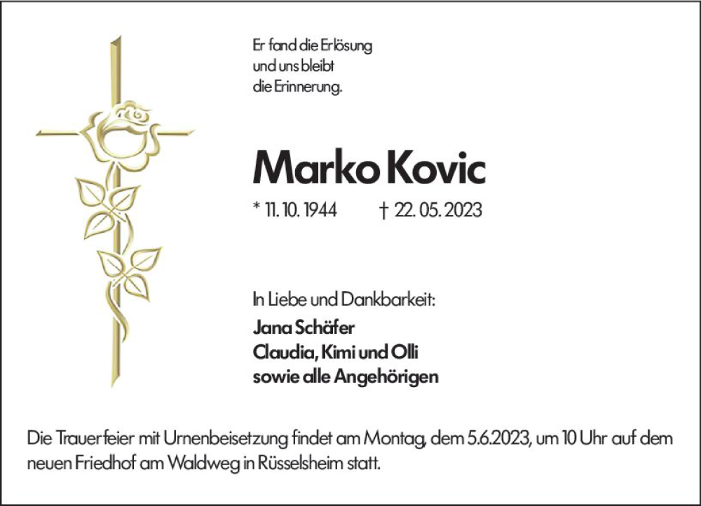 Hier finden Sie alle Traueranzeigen aus der Zeitung, die bisher für Marko Kovic erschienen sind. Weitere Traueranzeigen, die in der Zeitung erscheinen, werden hier ebenfalls aufgelistet