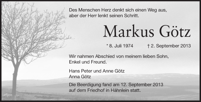 Hier finden Sie alle Traueranzeigen aus der Zeitung, die bisher für Markus Götz erschienen sind. Weitere Traueranzeigen, die in der Zeitung erscheinen, werden hier ebenfalls aufgelistet