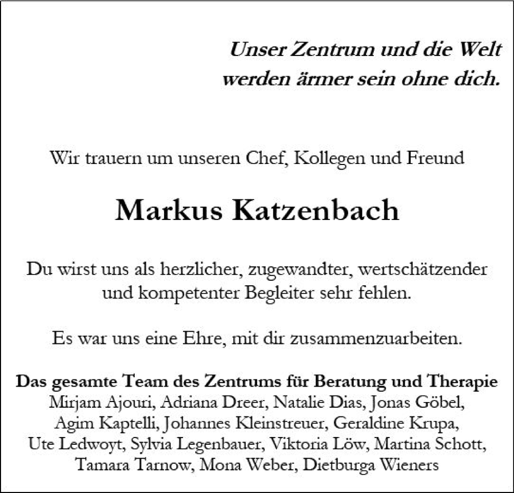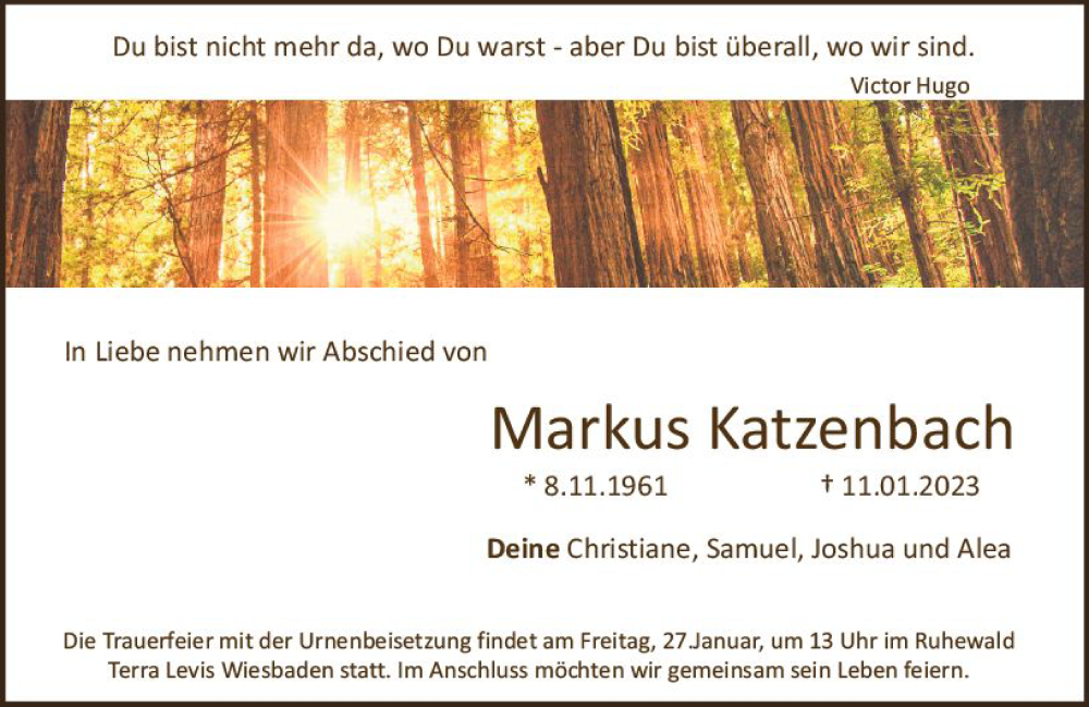 Hier finden Sie alle Traueranzeigen aus der Zeitung, die bisher für Markus Katzenbach erschienen sind. Weitere Traueranzeigen, die in der Zeitung erscheinen, werden hier ebenfalls aufgelistet