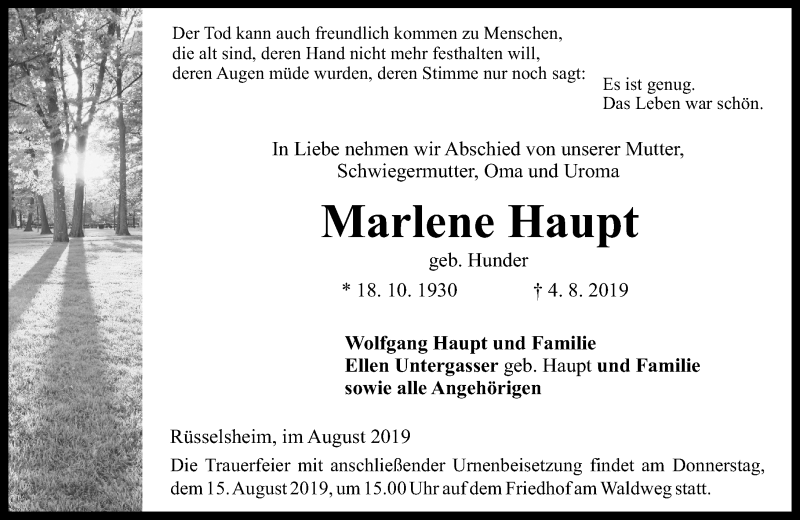 Hier finden Sie alle Traueranzeigen aus der Zeitung, die bisher für Marlene Haupt erschienen sind. Weitere Traueranzeigen, die in der Zeitung erscheinen, werden hier ebenfalls aufgelistet