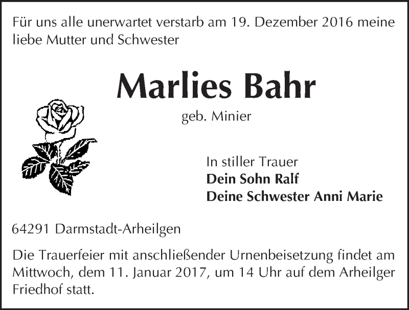 Hier finden Sie alle Traueranzeigen aus der Zeitung, die bisher für Marlies Bahr erschienen sind. Weitere Traueranzeigen, die in der Zeitung erscheinen, werden hier ebenfalls aufgelistet