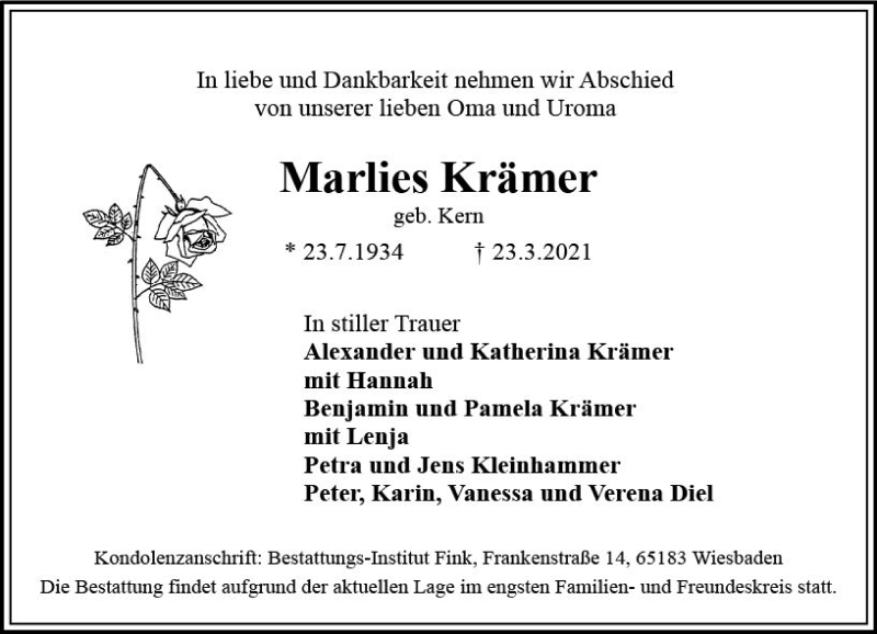 Hier finden Sie alle Traueranzeigen aus der Zeitung, die bisher für Marlies Krämer erschienen sind. Weitere Traueranzeigen, die in der Zeitung erscheinen, werden hier ebenfalls aufgelistet