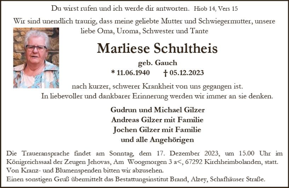 Hier finden Sie alle Traueranzeigen aus der Zeitung, die bisher für Marliese Schultheis erschienen sind. Weitere Traueranzeigen, die in der Zeitung erscheinen, werden hier ebenfalls aufgelistet