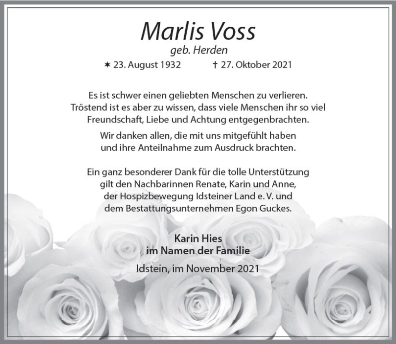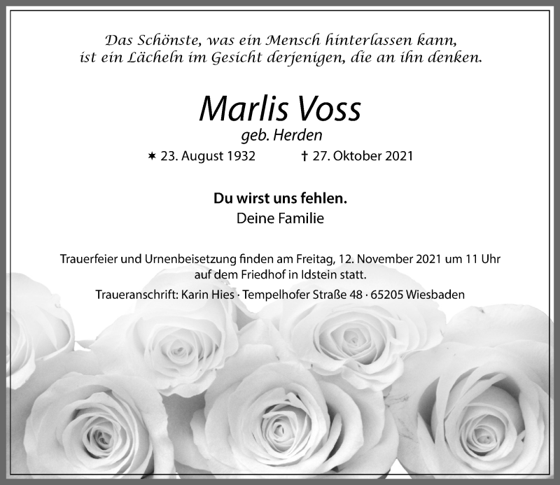 Hier finden Sie alle Traueranzeigen aus der Zeitung, die bisher für Marlis Voss erschienen sind. Weitere Traueranzeigen, die in der Zeitung erscheinen, werden hier ebenfalls aufgelistet