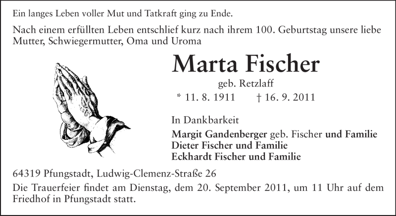 Hier finden Sie alle Traueranzeigen aus der Zeitung, die bisher für Marta Fischer erschienen sind. Weitere Traueranzeigen, die in der Zeitung erscheinen, werden hier ebenfalls aufgelistet