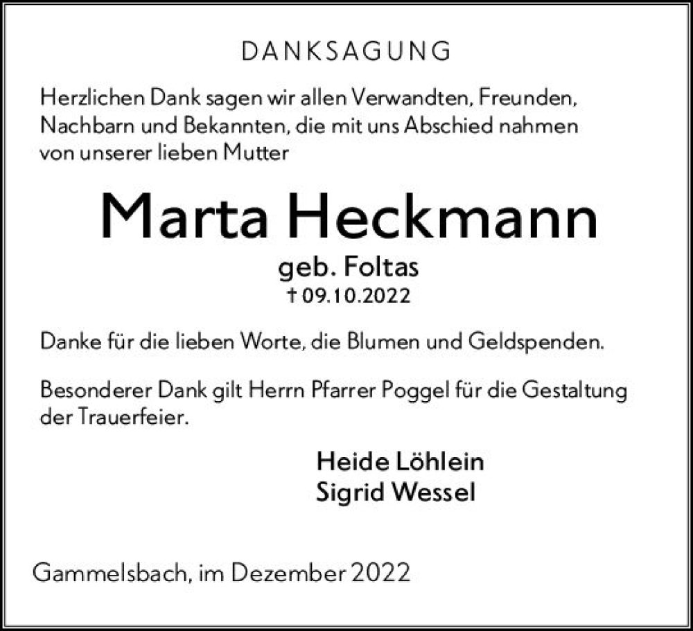 Hier finden Sie alle Traueranzeigen aus der Zeitung, die bisher für Marta Heckmann erschienen sind. Weitere Traueranzeigen, die in der Zeitung erscheinen, werden hier ebenfalls aufgelistet