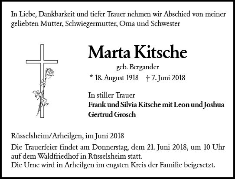 Hier finden Sie alle Traueranzeigen aus der Zeitung, die bisher für Marta Kitsche erschienen sind. Weitere Traueranzeigen, die in der Zeitung erscheinen, werden hier ebenfalls aufgelistet