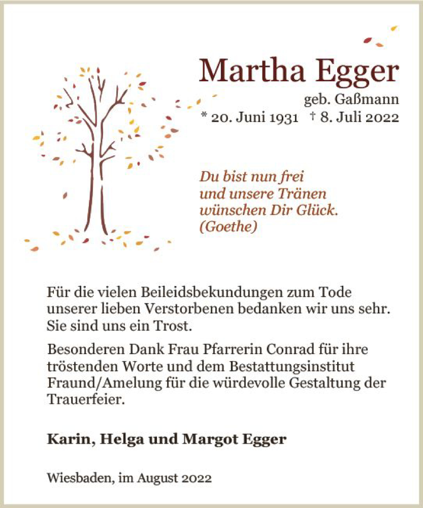 Hier finden Sie alle Traueranzeigen aus der Zeitung, die bisher für Martha Egger erschienen sind. Weitere Traueranzeigen, die in der Zeitung erscheinen, werden hier ebenfalls aufgelistet