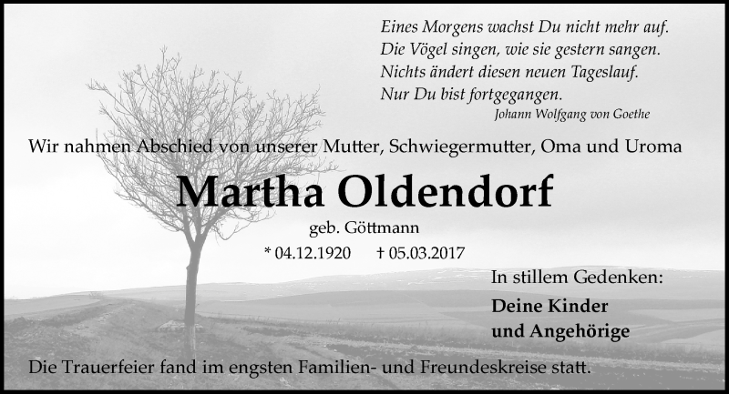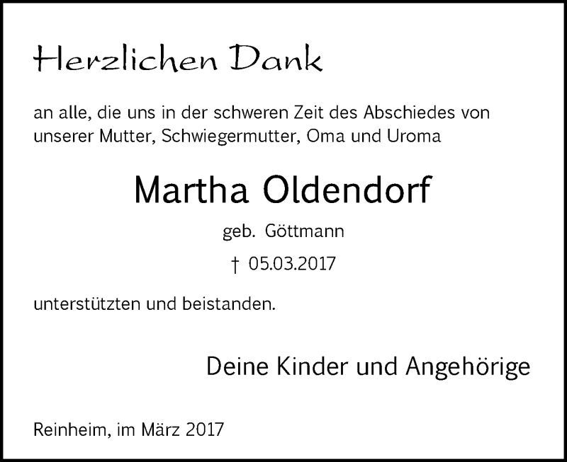 Hier finden Sie alle Traueranzeigen aus der Zeitung, die bisher für Martha Oldendorf erschienen sind. Weitere Traueranzeigen, die in der Zeitung erscheinen, werden hier ebenfalls aufgelistet