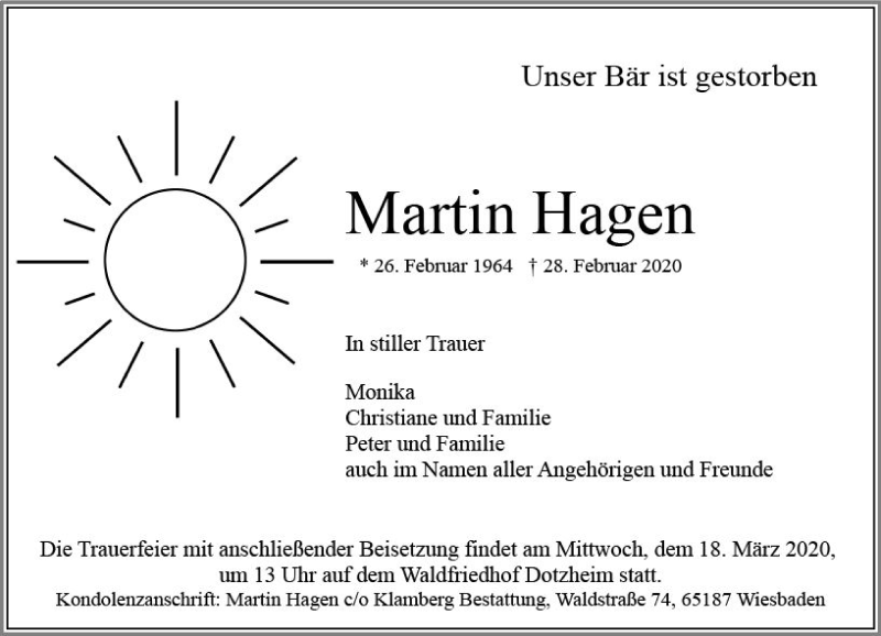 Hier finden Sie alle Traueranzeigen aus der Zeitung, die bisher für Martin Hagen erschienen sind. Weitere Traueranzeigen, die in der Zeitung erscheinen, werden hier ebenfalls aufgelistet