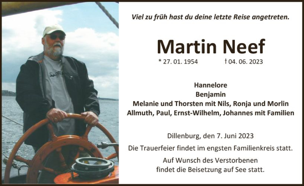 Hier finden Sie alle Traueranzeigen aus der Zeitung, die bisher für Martin Neef erschienen sind. Weitere Traueranzeigen, die in der Zeitung erscheinen, werden hier ebenfalls aufgelistet