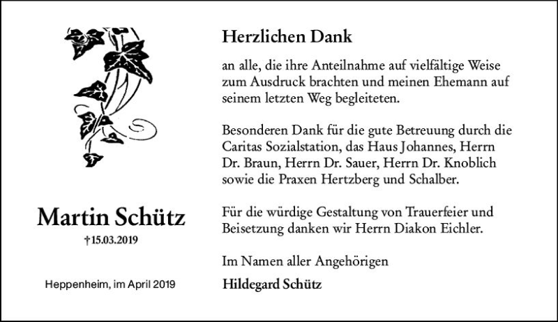 Hier finden Sie alle Traueranzeigen aus der Zeitung, die bisher für Martin Schütz erschienen sind. Weitere Traueranzeigen, die in der Zeitung erscheinen, werden hier ebenfalls aufgelistet