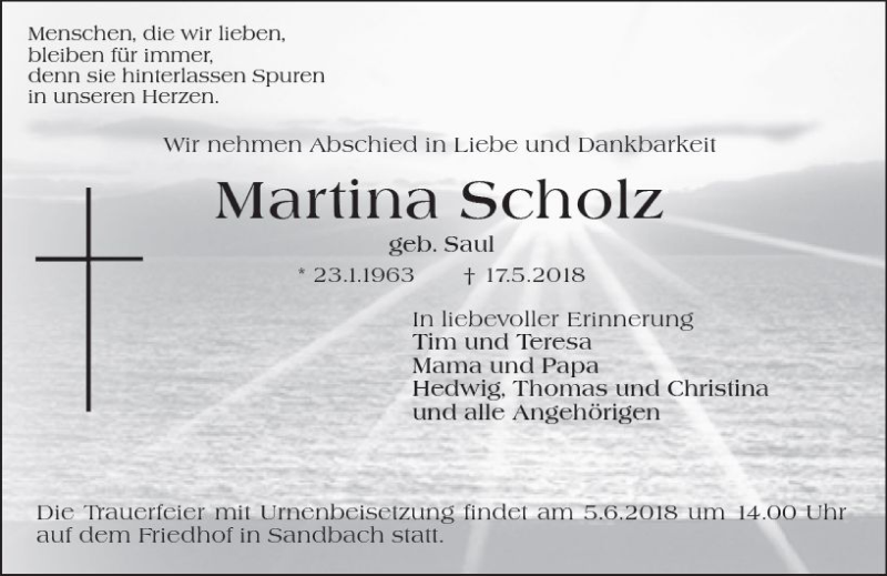 Hier finden Sie alle Traueranzeigen aus der Zeitung, die bisher für Martina Scholz erschienen sind. Weitere Traueranzeigen, die in der Zeitung erscheinen, werden hier ebenfalls aufgelistet