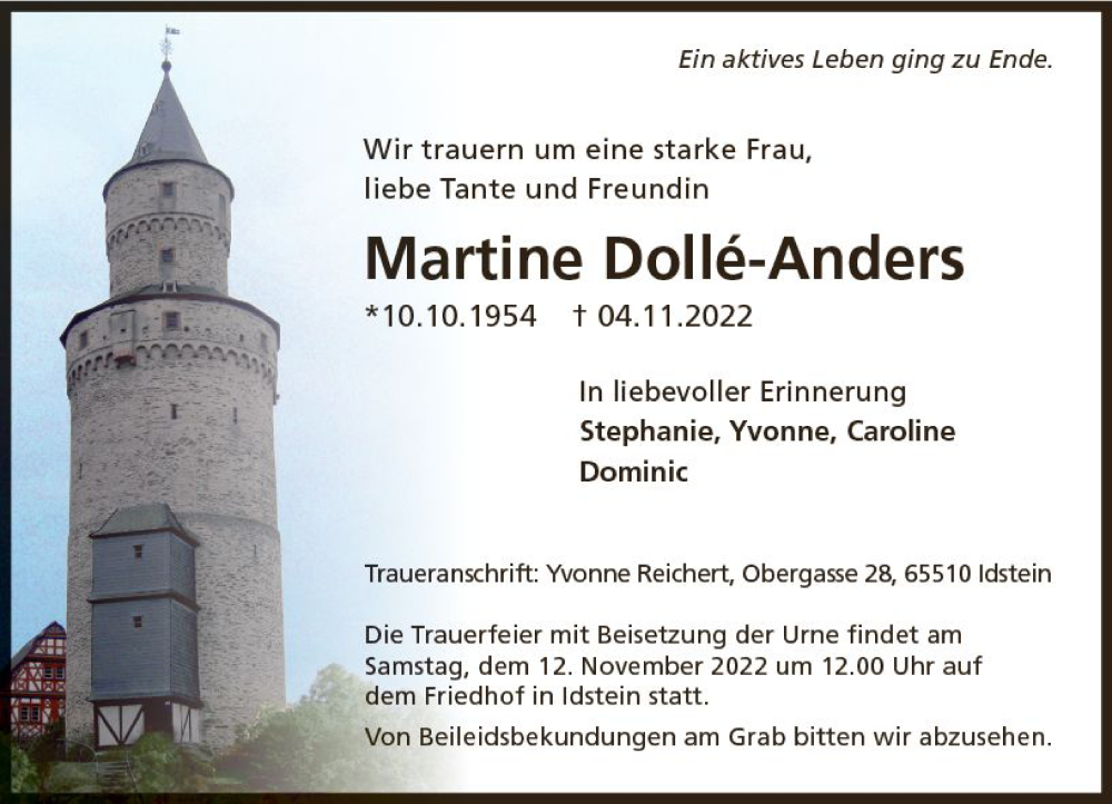 Hier finden Sie alle Traueranzeigen aus der Zeitung, die bisher für Martine Dolle-Anders erschienen sind. Weitere Traueranzeigen, die in der Zeitung erscheinen, werden hier ebenfalls aufgelistet
