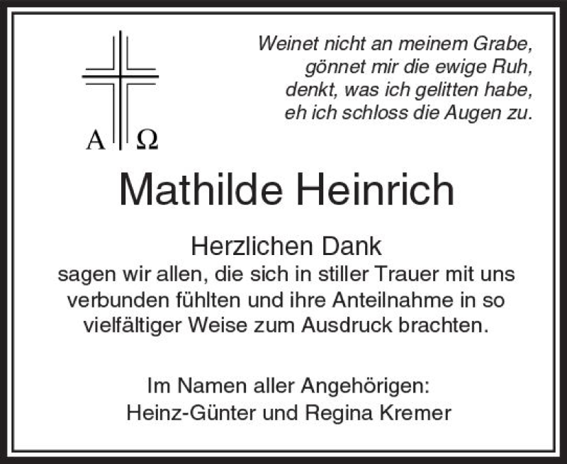 Hier finden Sie alle Traueranzeigen aus der Zeitung, die bisher für Mathilde Heinrich erschienen sind. Weitere Traueranzeigen, die in der Zeitung erscheinen, werden hier ebenfalls aufgelistet