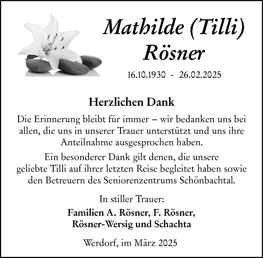 Hier finden Sie alle Traueranzeigen aus der Zeitung, die bisher für Mathilde Rösner erschienen sind. Weitere Traueranzeigen, die in der Zeitung erscheinen, werden hier ebenfalls aufgelistet