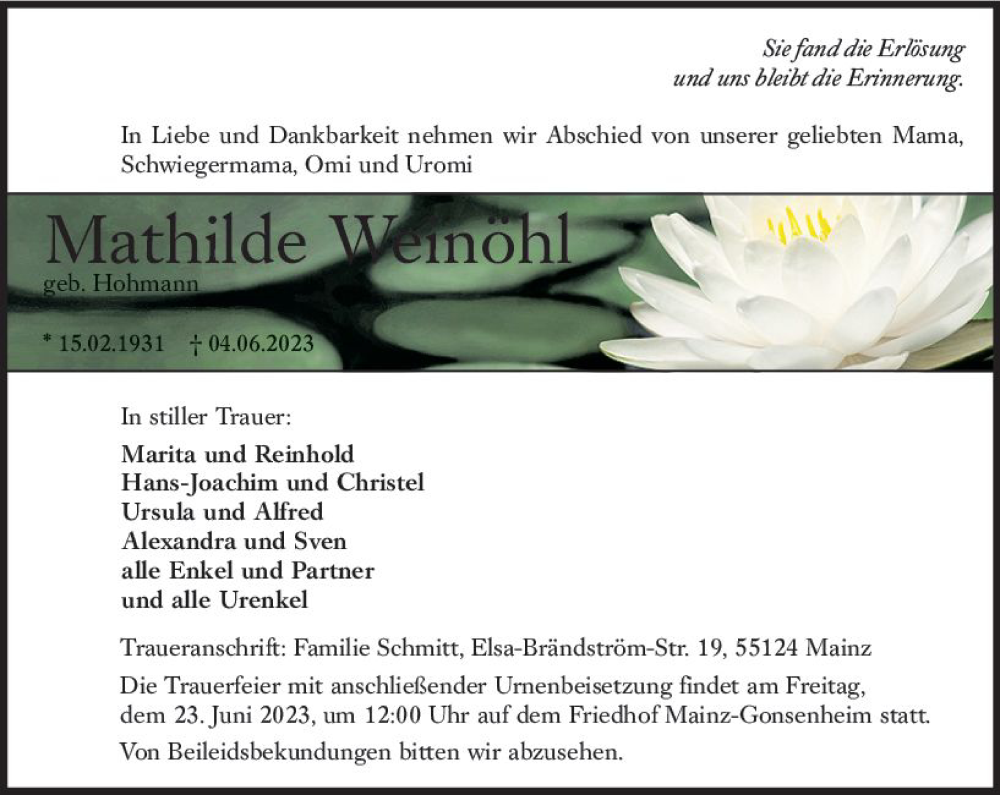 Hier finden Sie alle Traueranzeigen aus der Zeitung, die bisher für Mathilde Weinöhl erschienen sind. Weitere Traueranzeigen, die in der Zeitung erscheinen, werden hier ebenfalls aufgelistet