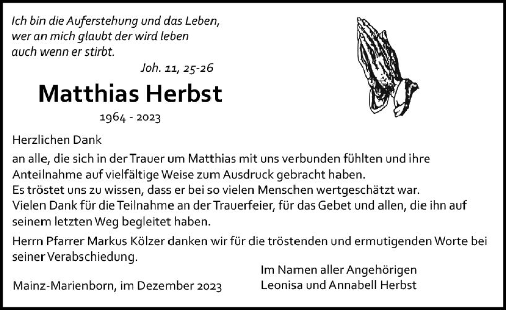 Hier finden Sie alle Traueranzeigen aus der Zeitung, die bisher für Matthias Herbst erschienen sind. Weitere Traueranzeigen, die in der Zeitung erscheinen, werden hier ebenfalls aufgelistet
