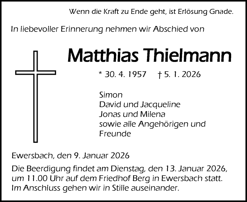 Hier finden Sie alle Traueranzeigen aus der Zeitung, die bisher für Matthias Thielmann erschienen sind. Weitere Traueranzeigen, die in der Zeitung erscheinen, werden hier ebenfalls aufgelistet